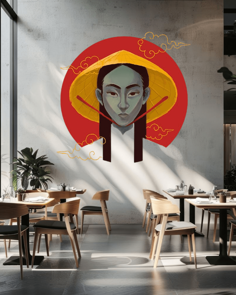 - Tranh phong cách hiện đại (vector, pop-art): Biến hình ảnh lịch sử thành mảng màu tươi trẻ, phù hợp quán hướng tới khách hàng trẻ.