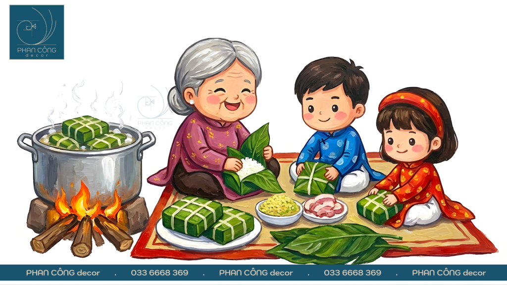 Mẫu tranh gói bánh chưng này thường được lựa chọn cho quán cà phê và cửa hàng nhỏ. Tranh giúp không gian trở nên nhẹ nhàng và dễ tiếp cận.